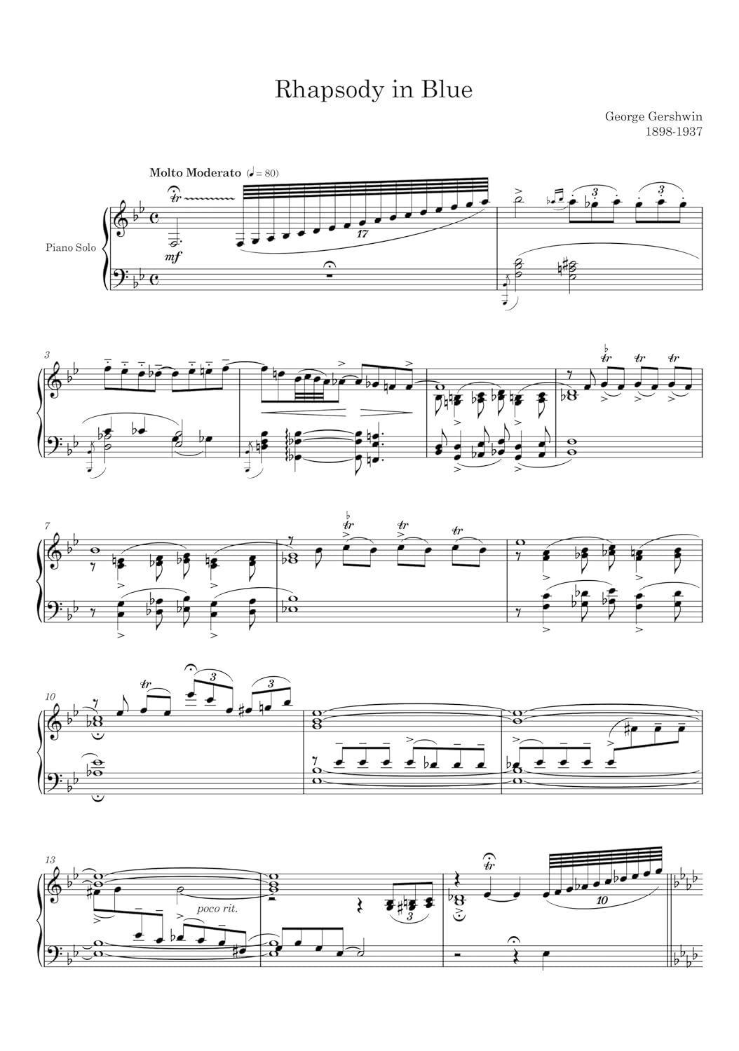 Sheet music for Gershwin’s Rhapsody in Blue, arranged for solo piano by Gershwin.